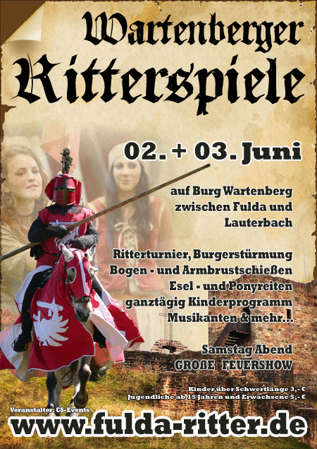 "Bertho II. von Leibolz" Abt von Fulda lässt folgend Kund tun. In diesem Jahre Anno 2012 will er Euch mehr Reichtum und Ländereien schenken. Aus diesem Grunde werden wir, seine befreundeten Adelsleut, Ritter und unsere Truppen, am 02. und 03.06. die Wartenburg in Wartenberg-Angersbach erstürmen, diese niederbrennen und uns die Ländereien aneignen. Die Jungfrauen werden wir versteigern und die Männer Euch als Sklaven schenken