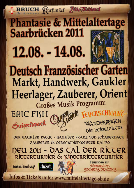 Mit mehr als 25.000 Besuchern und laut Meinungsumfrage bei den Gästen, die schönste Veranstaltung in Saarbrücken 2010. Mit diesem Hintergrund starten die Macher der Phantasie & Mittelaltertage ins Jahr 2011. Größer, Schöner und Bunter lautet das Motto 2011.