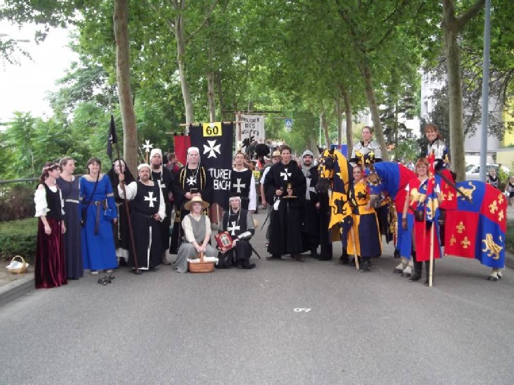 Ausschließlich ein mittelalterlicher Teil (Gruppe) während des Umzuges zum Brezelfest.