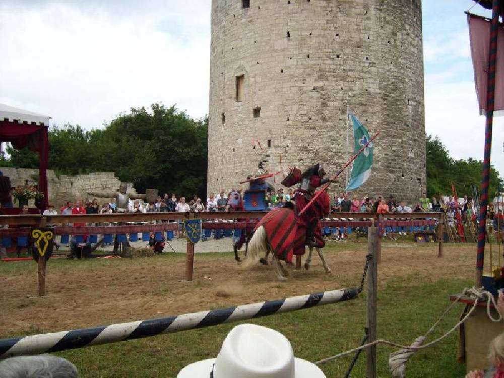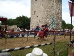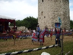 atemberaubende Tjoste in der hölzernen Turnierarena am Fuße des Bergfriedes