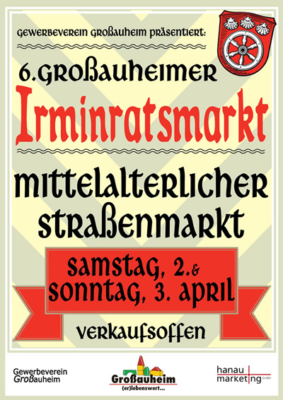Bereits ab Samstagfrüh können die Besucher ungestört bummeln und flanieren und sich von der Leistungsfähigkeit der Großauheimer Einzelhandels überzeugen. Dazu ist am Sonntag, 3.April, von 12 bis 18 Uhr verkaufsoffener Straßenmarkt. Die ideale Gelegenheit, das Angenehme mit dem Nützlichen - Einkauf und Unterhaltung für die gesamte Familie - zu verbinden! Passend zum historischen Anlass tragen die Großauheimer Geschäftsleute mittelalterliche Kostüme und versprechen ihren Kunden zum Irminratsmarkt ganz besondere Angebote.