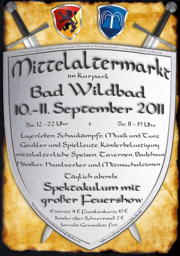 Besucht uns auf dem Mittelaltermarkt zu Bad Wildbad 2011 und erlebt die Spieluden von Satolstelamanderfanz, dem Duo Obscurum und Stella Splendens. Erfreuet Euch an den Gauklern Azur und Amaranth, dem Theater Dilletantus Maximus oder Xander dem Magier. Lauschet den Gesängen des Cantores Badensis und tanzt mit Turma Saltatorius im mittelalterlichen Reigen.