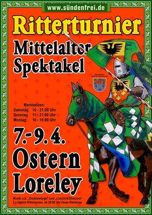 Zwei Mal am Tage ruft der Herold zum großen Ritterturnier- Lanzenstechen, Schwertkämpfe, Artistik. Am Samstag- und Sonntagabend bringen die Ritter zum Abschluss des Tages eine Feuer- Reitshow.