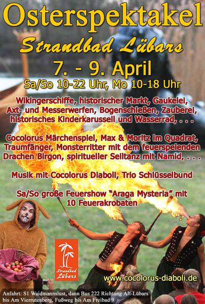 Auf dem Osterspektakel mit großem historischem Markt, Ritter- und Wikingerlagern werden über 100 Akteure ein buntgemischtes Programm für Jung und Alt mit Musik und Gaukelei bieten. Besonders die Kinder können sich auf mehrere Märcheninszenierungen und auf die Ritterkämpfe mit dem feuerspuckenden Drachen Birgon freuen. Mit dabei ist der Zauberer Santini sowie spiritueller Seiltanz mit Namid.