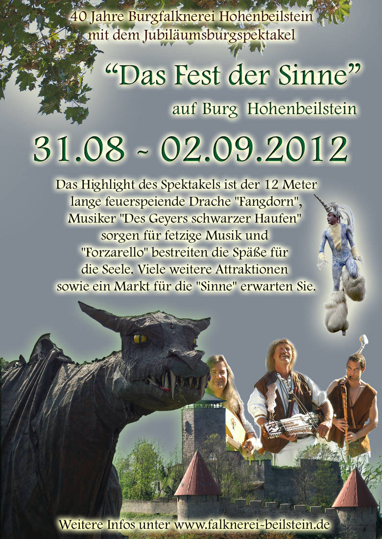 Die Burgfalknerei Hohenbeilstein feiert Ihr 40 jähriges Bestehen mit einem gigantischen Burgspektakel und "Fest der Sinne" mit großem Markt vom