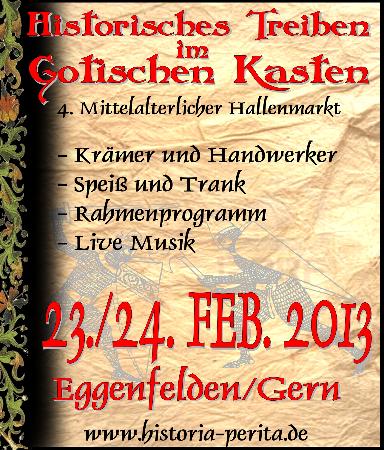 Es ist wieder soweit, vom 23.-24. Februar 2013 wird das historische Treiben stattfinden. Zum vierten mal verwandeln sich dann die Räumlichkeiten des gotische Kasten wiederholt in einen mittelalterlichen Hallenmarkt. Zurück aus der Vergangenheit werden uns