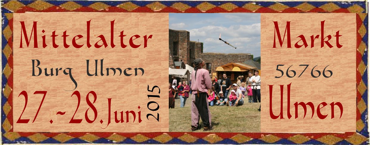 Hoch über dem Vulkanmaar von Ulmen liegt die Burgruine und bietet eine wunderbare Kulisse für einen kleinen und qualitativen Mittelaltermarkt ca 26 Stände und 4 Lager finden auf der Burg ihren Platz, und so werden zum wiederholten Male die Besucher sich auf diesen Markt wieder freuen. Besondere Handwerker wie z.B. Fahnen- und Bannermaler, Siegelgraveur, Lichterzieher, Schmied, Wollfärber und andere zeigen Ihre Künste. ausgesuchte Händer feilen um die Gunst der Besucher und deren Einkauf. Speis und Trank, handgetriebenes Riesenrad und noch mehr werden für Kurzweil sorgen, genauso wie Gaukler und Musikanten.